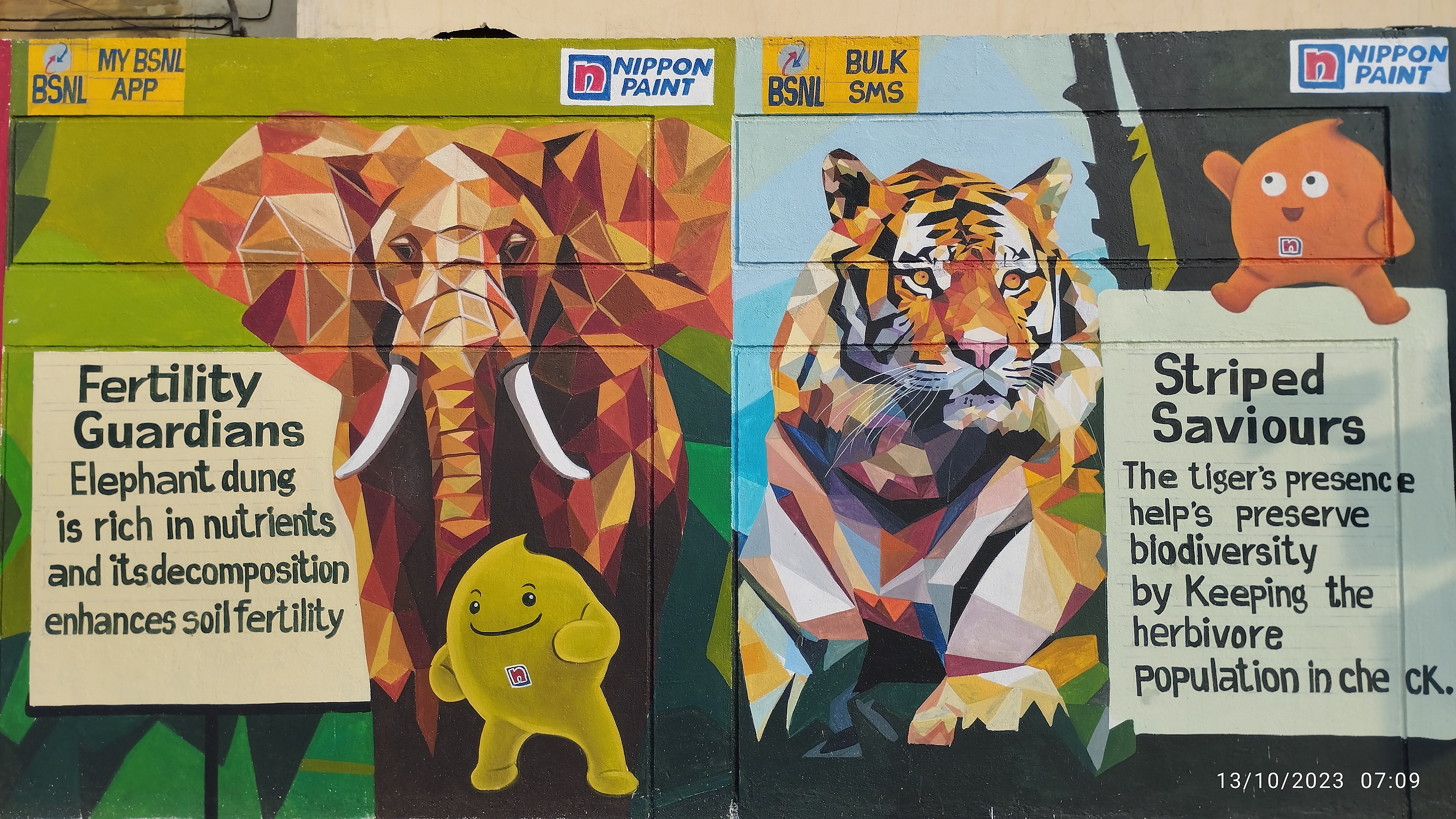 Mural artworks is an effective tool to convert large unused walls of the cities into places of attraction by drawing large and colorful paintings to convey messages that helps in socialisation, cognitive abilities, emotional capabilities and communication skills of people of all ages . Mural artworks at schools encourage students to study. It is enriching and stimulates critical thinking as well. Eco Society India is creating awareness through Mural artworks in Schools by making it into an attractive place to study and making student feels relaxed to study thereby reducing dropout rates.