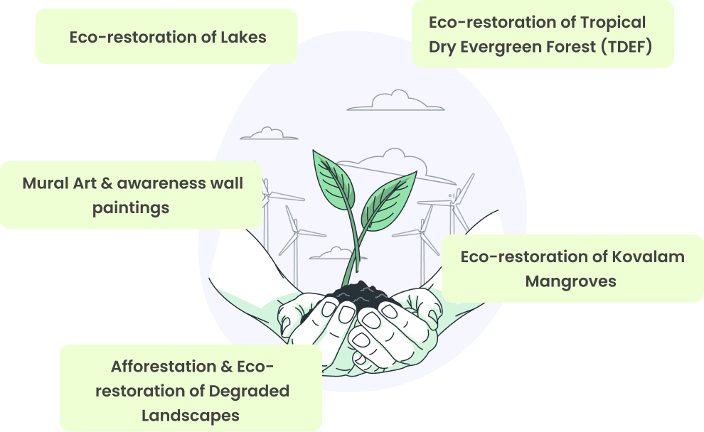 Eco Society India is actively working on restoring the barren areas by plantation and aiding natural recovery of the soil texture and fertility leading to an increase in the biodiversity and achieving sustainable delivery of ecosystem services such as microclimate regulation, recharge of ground water, and provide livelihood for the local communities and thereby creating an ecosystem that is resilient to climate change.